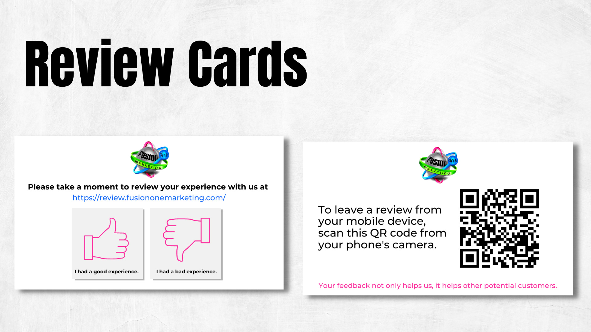 Create Review Cards with the QR code and distribute them to your sales team or field crew. When they meet face-to-face with customers, they can present this card at the end of the scheduled visit and ask customers to scan the QR code and leave a review on the spot. Review cards can also be a way to incentive your reps to generate more sales. (i.e., the rep with the most positive reviews wins a gift card)